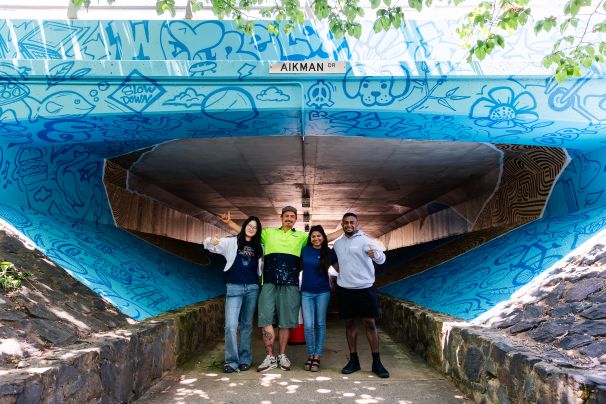 The underground walkway below Aikman Drive has been revamped by a colourful mural celebrating both the University of Canberra and the surrounding region, in a collaborative mission to bring young people together.