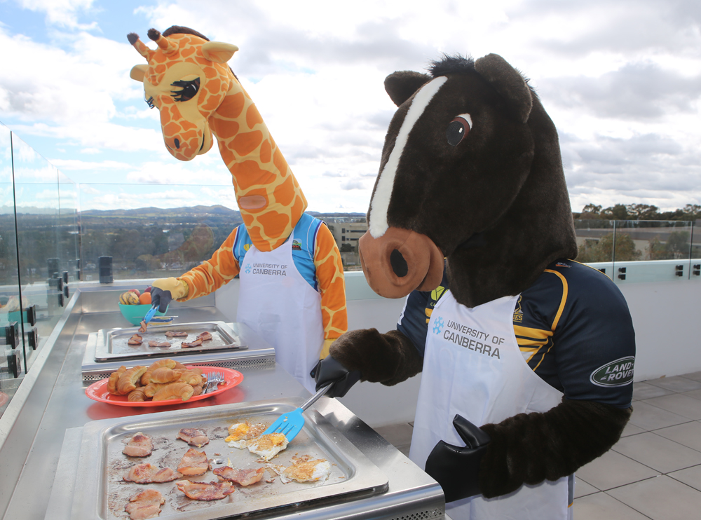 Potential students and their families are invited to enjoy breakfast served by University of Canberra Capitals' mascot Cappie the Giraffe and ACT Brumbies' mascot Brumby Jack before exploring the campus to see what studying at the University of Canberra is like.