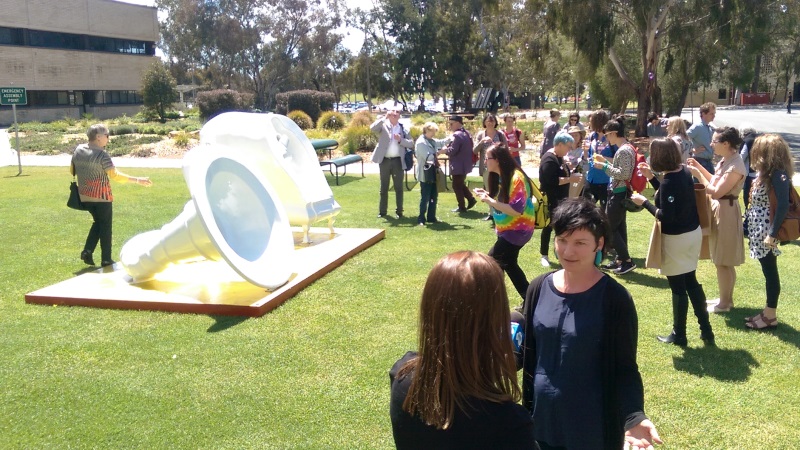 Canberrans are encouraged to visit the campus to play with the two artworks. Cosmic Trumpet is located outside on the grassed area east of Building 1, while Embracer will be installed in the Hub on the Concourse and can be seen during normal office hours.