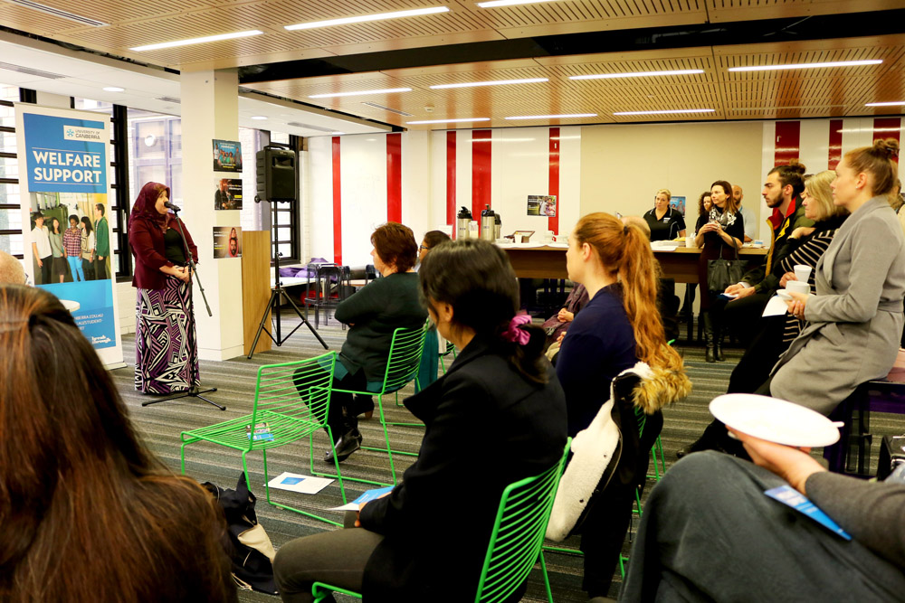 UC alumna Diana Abdel-Rahman was the special guest speaker at the morning tea, which was organised by the University of Canberra’s Student Welfare office. All proceeds from the event went towards Companion House, a non-profit organisation that works with people who have sought refuge in Australia from persecution, torture and war-related trauma.