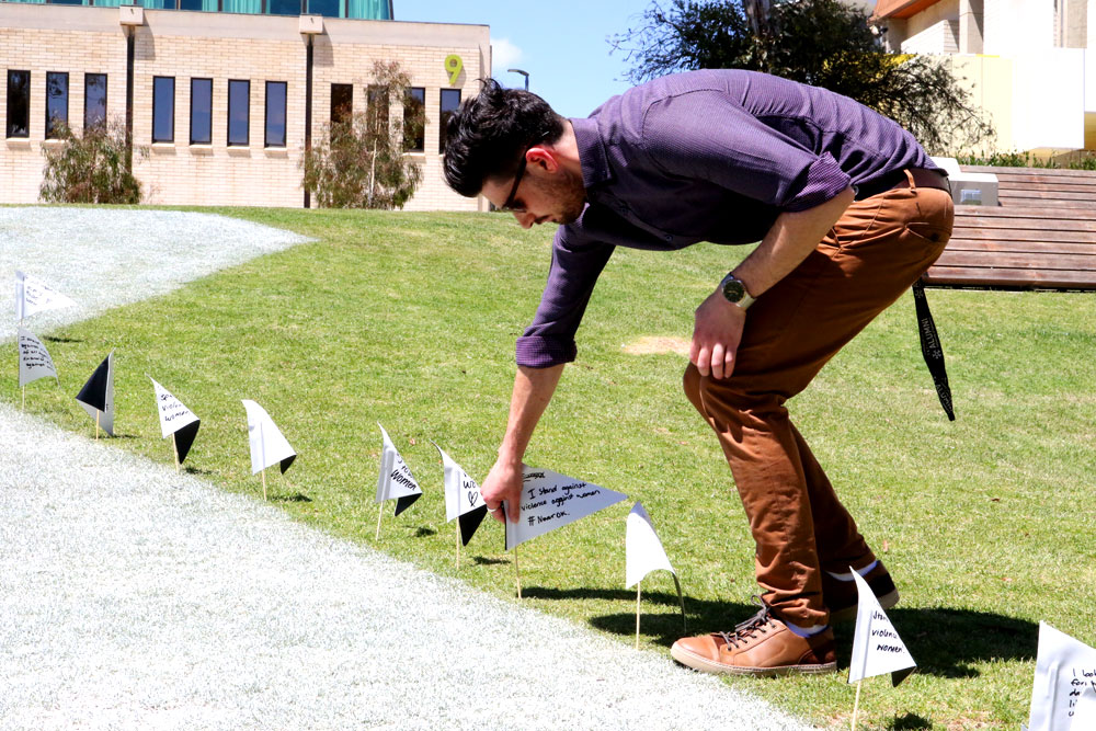 As part of the event, staff, students and guests were invited to write a personal message of support or pledge on a flag, and place it around a giant white ribbon painted on the southern concourse grass area.