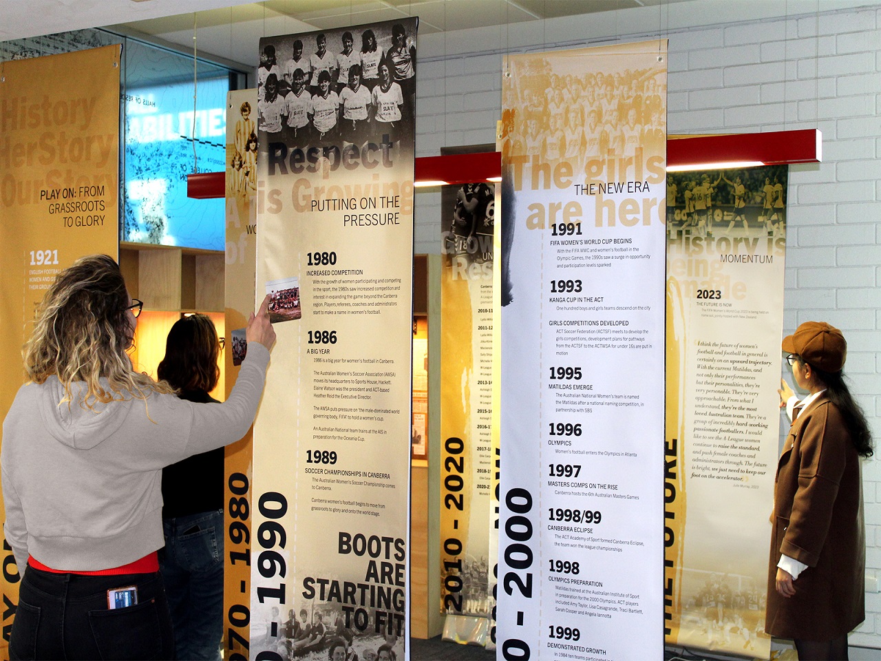 Interactive displays chronicle the stories, match footage, interviews and more of the women’s game and its community here in Canberra. PLAY ON is a tribute to the past, present and future of women’s football.