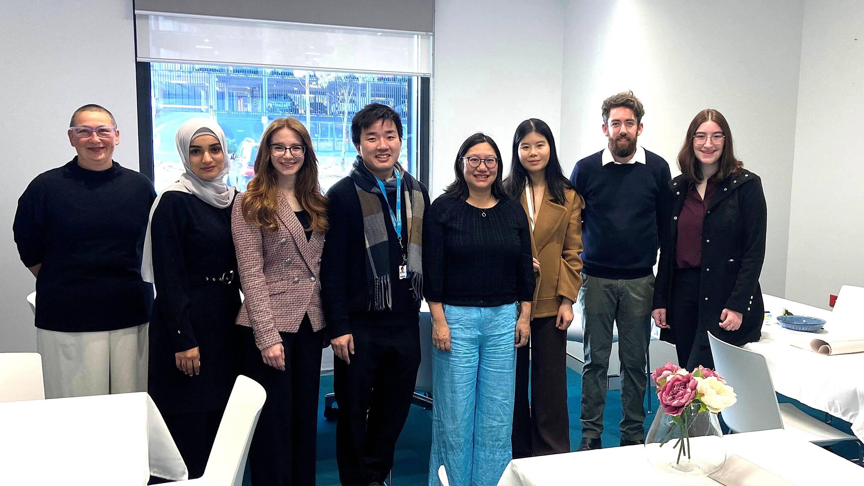 Left to right: Bella St Clair (World Café External Facilitator), Mona Al-Sulaiman (Optometry student), Dayna Rixon (Optometry student), Dr Terry Ho (Optometrist and investigator), Associate Professor Mei Ying Boon (Chief investigator), Michelle Noronha (Research assistant), Mitchell McEwan (Optometry student), Zoe Greenstein (Optometry student)