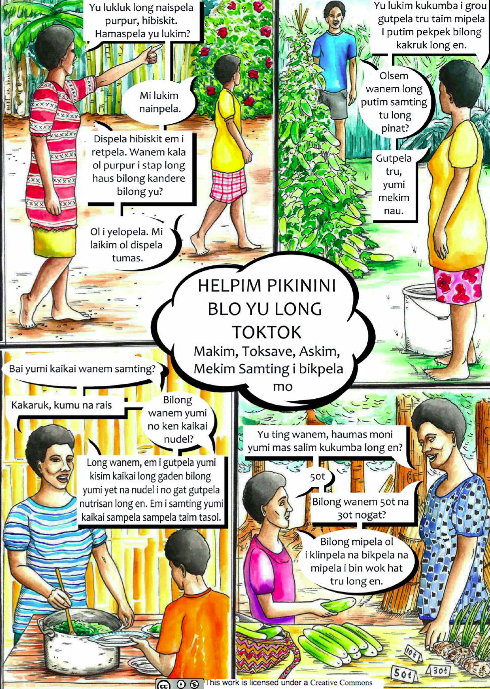 The books were created and designed in collaboration with local women leaders and farmers in two project sites in PNG (see below for further details). We thank the local collaborators for their contributions that make these books truly ‘place-based’ and ‘place-informed’. There are four illustrated dual language (Tok Pisin and English) children’s books within the ‘Maria’s family’ books series.