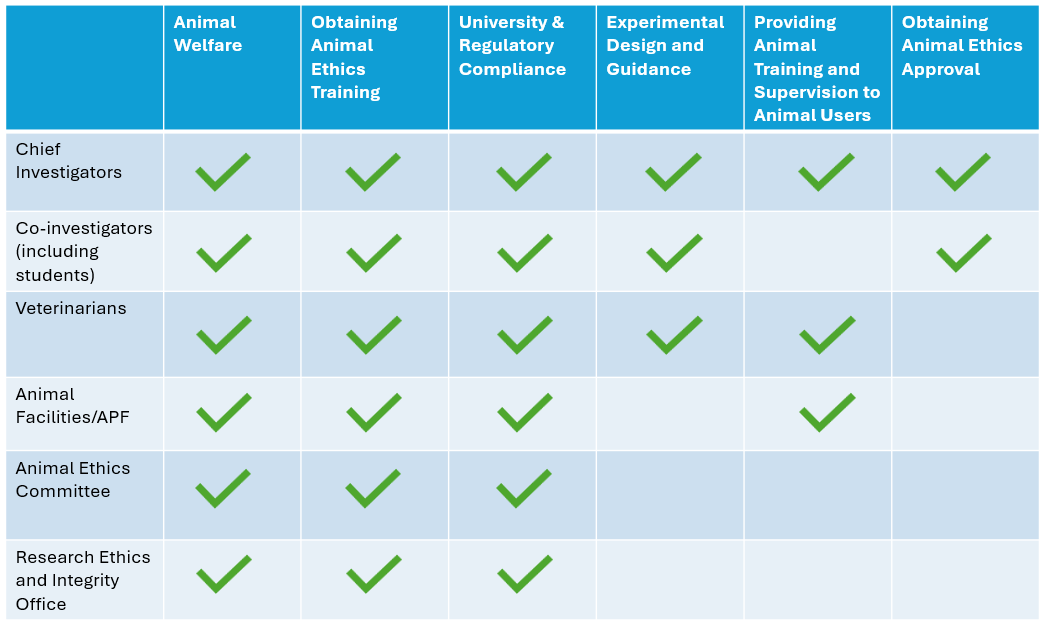 Responsibilities according to the Australian code for the care and use of animals for scientific purposes