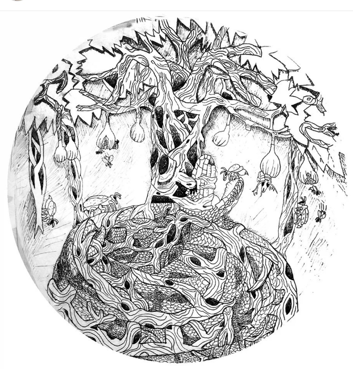In Eternal Weave: The Entanglement of Fig and Serpent, I explore the interconnectedness of life, death, and regeneration through the fusion of natural and mythological elements. The strangling fig, with its intricate network of roots, symbolizes symbiosis and the complex dependencies in nature, while the Norse Midgard Serpent, Jormungand, represents the cyclical nature of existence, encircling the world in myth. By merging these two forms, I aim to evoke a sense of the universe's perpetual flow, using detailed line work to reflect the entanglement of natural forces.