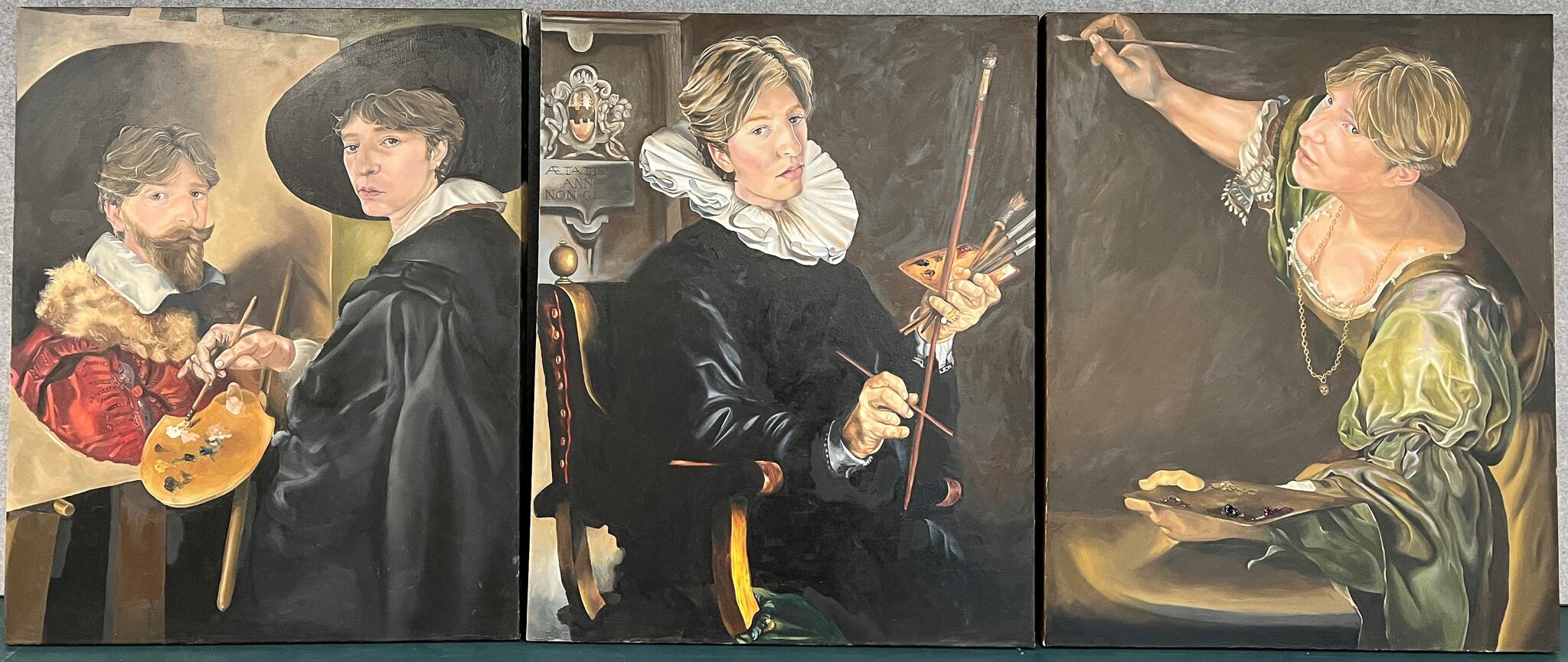 My body of work investigates artistic identity by incorporating my face into famous self-portraits of both male and female artists. By digitally merging my likeness with iconic portraits I create a dialogue between my contemporary self and these historical figures. This juxtaposition highlights my personal connection to their legacies and suggests that artistic expression transcends gender and time, revealing a shared creative spirit among artists.