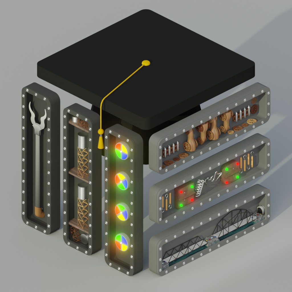 The Engineering faculty at Mansfield has designed and implemented their logo into various projects over the past year. Although the logo is fairly new, it has inspired me so much. The logo is a simple isometric cubic shape with the bottom left resembling an M (for Mansfield), the bottom right resembling an E (for engineering), and the flat top resembling a graduation hat. I have taken the meanings of the shapes and expanded on them to create this render through countless hours in the open source 3d modeling software known as Blender and consulting with teachers.