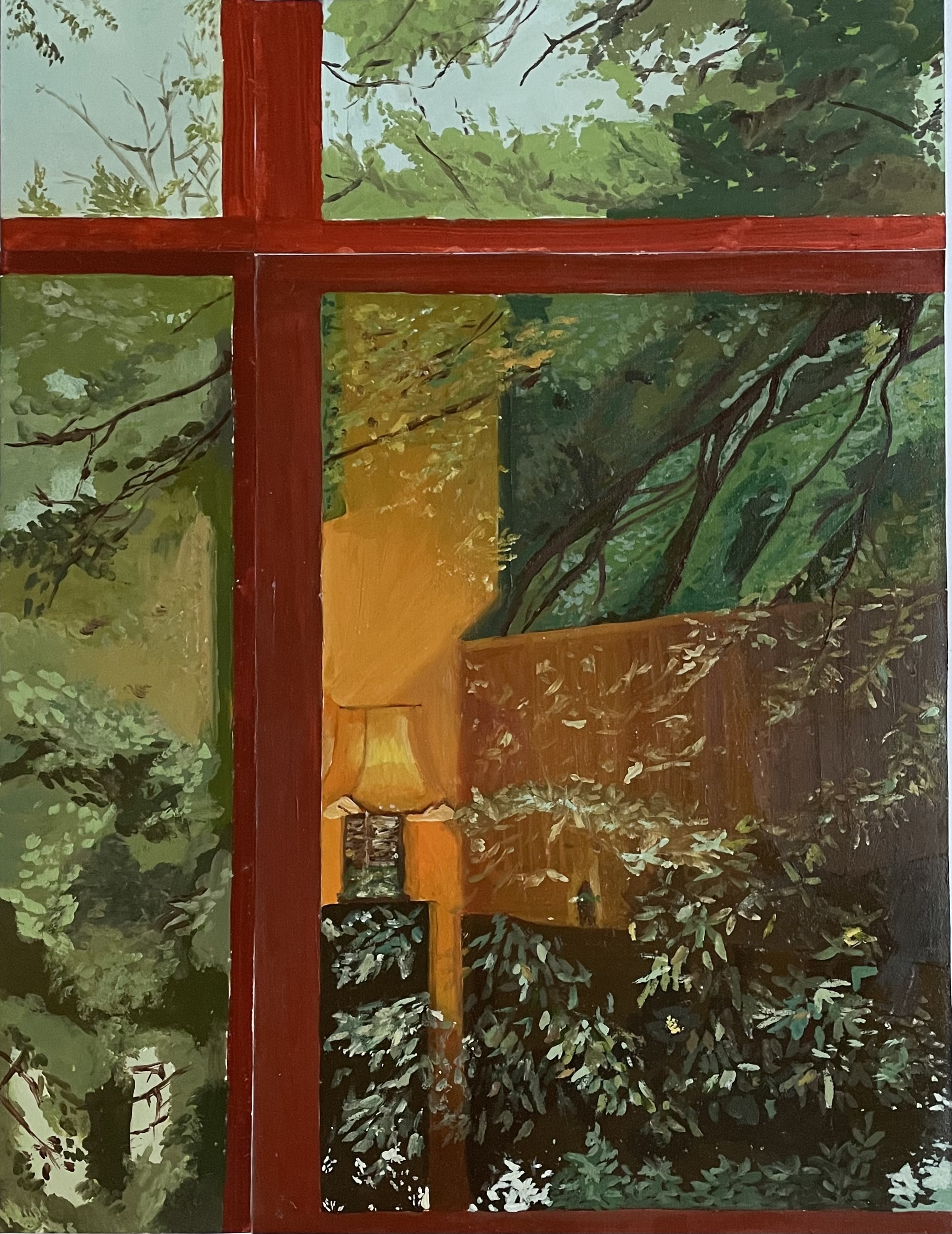 I chose to explore the concept of a home and a space that is protected from outside to explore the theme of symbolism and significance. The reflection of the warm lamp on the window shows how depending on your point of view, what can be seen through the window is different. The physical division between the panes of the window shows the separation of the interior of the house and outside. I have used oil paint to create this painting and was influenced by photos taken from my own home as well as the interior compositions of Matisse and Margaret Olley.