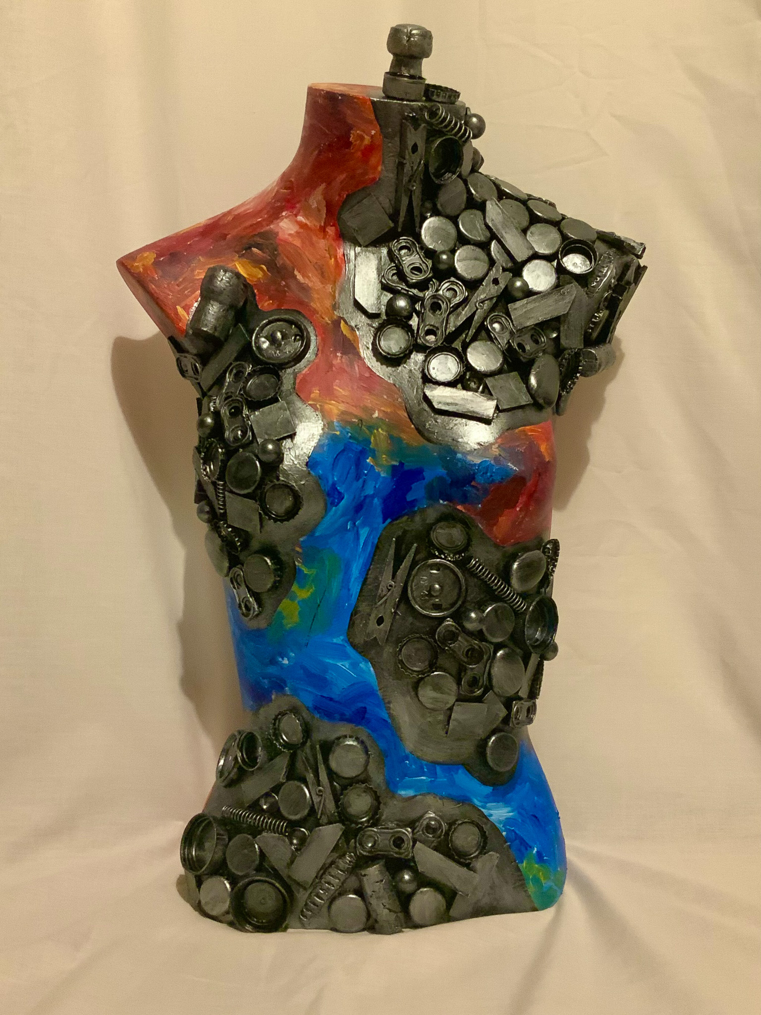 Exploring the theme of journey this sculpture represents and reflects self identity. As a young queer person, trying to navigate and find my own personal sense of identity has been difficult, overwhelming and convoluted. This experience has been reflected through the swirling of contrasting colours and groupings on objects. These found objects represent the memories and experiences that can shape a person’s own identity along their journey of self discovery.