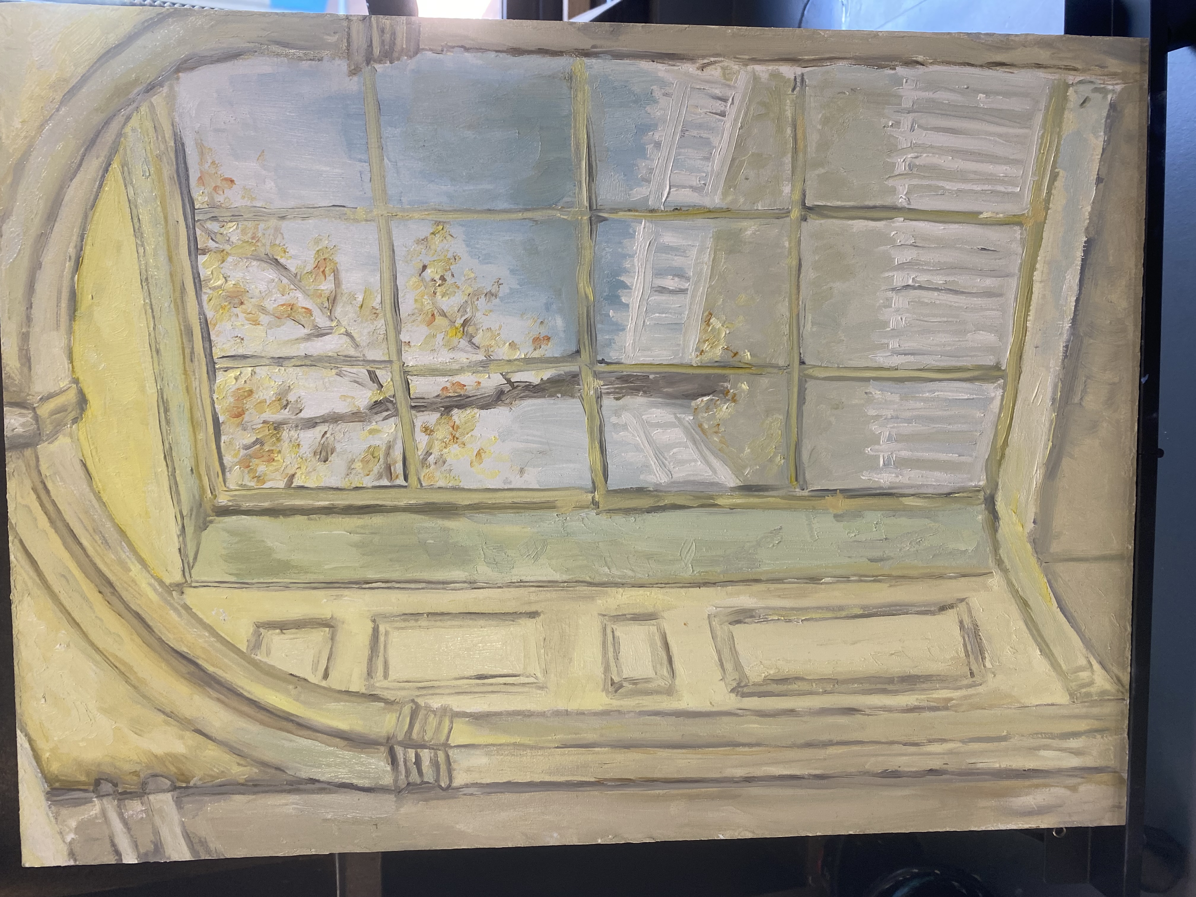 Oil paint on wood, inspired by a picture of a neighbourhood through a window, but reimagined in a simplistic impressionist style, with focus only on a tree outside. The colour palette is kept purposely highkey and muted, the painting itself highly simplified, with wavering lines and soft contrast to mimic long distant memories. The painting is inspired by feelings of nostalgia and cold mornings.