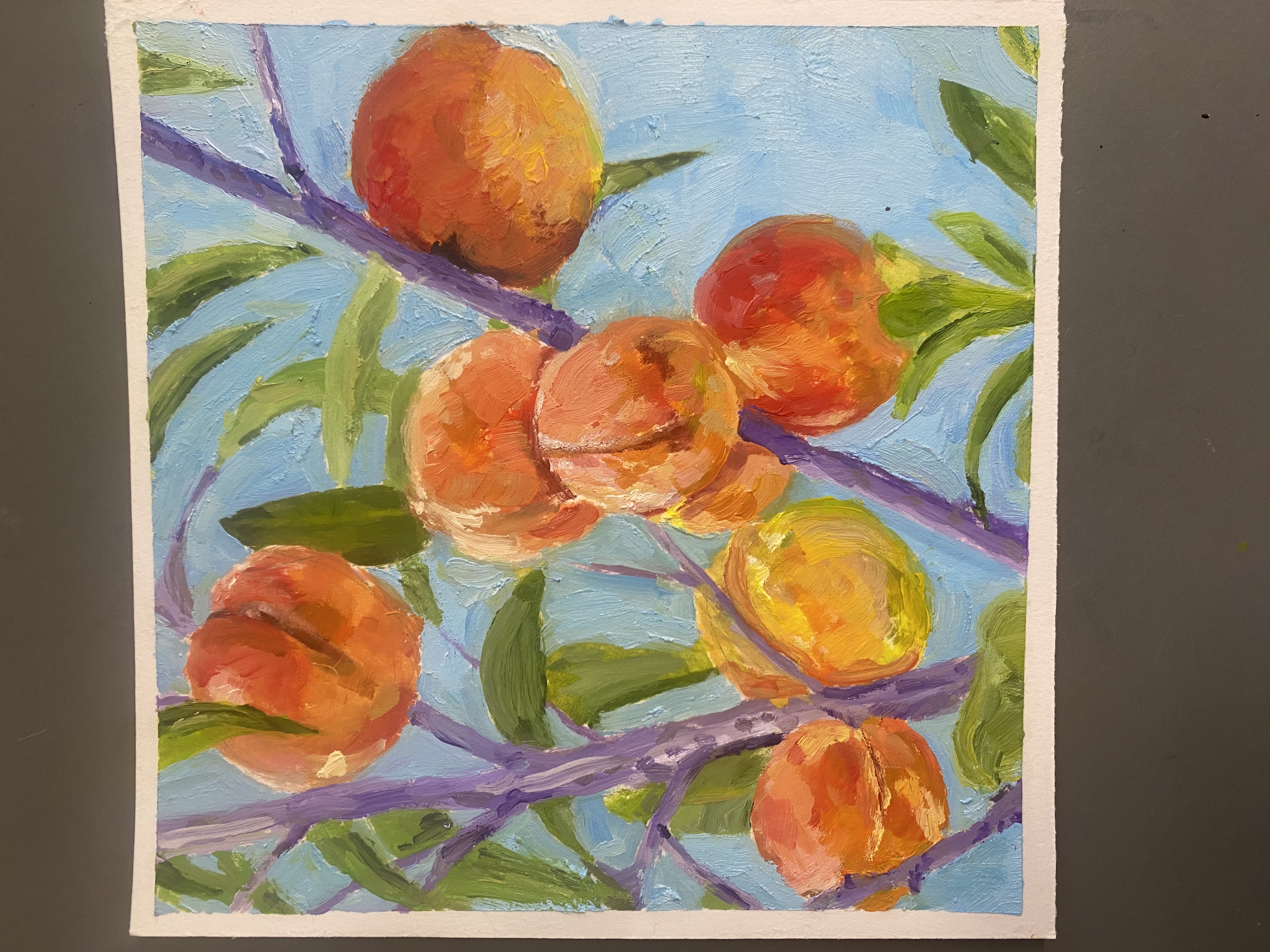 This painting is oil on paper, inspired by a picture of peaches, and I love the vibrancy and natural colours in the image, however I wanted to recreate it with visual focus on the peaches and an extra vibrant colour palette. This painting was painted during winter, when I was extra missing summer.