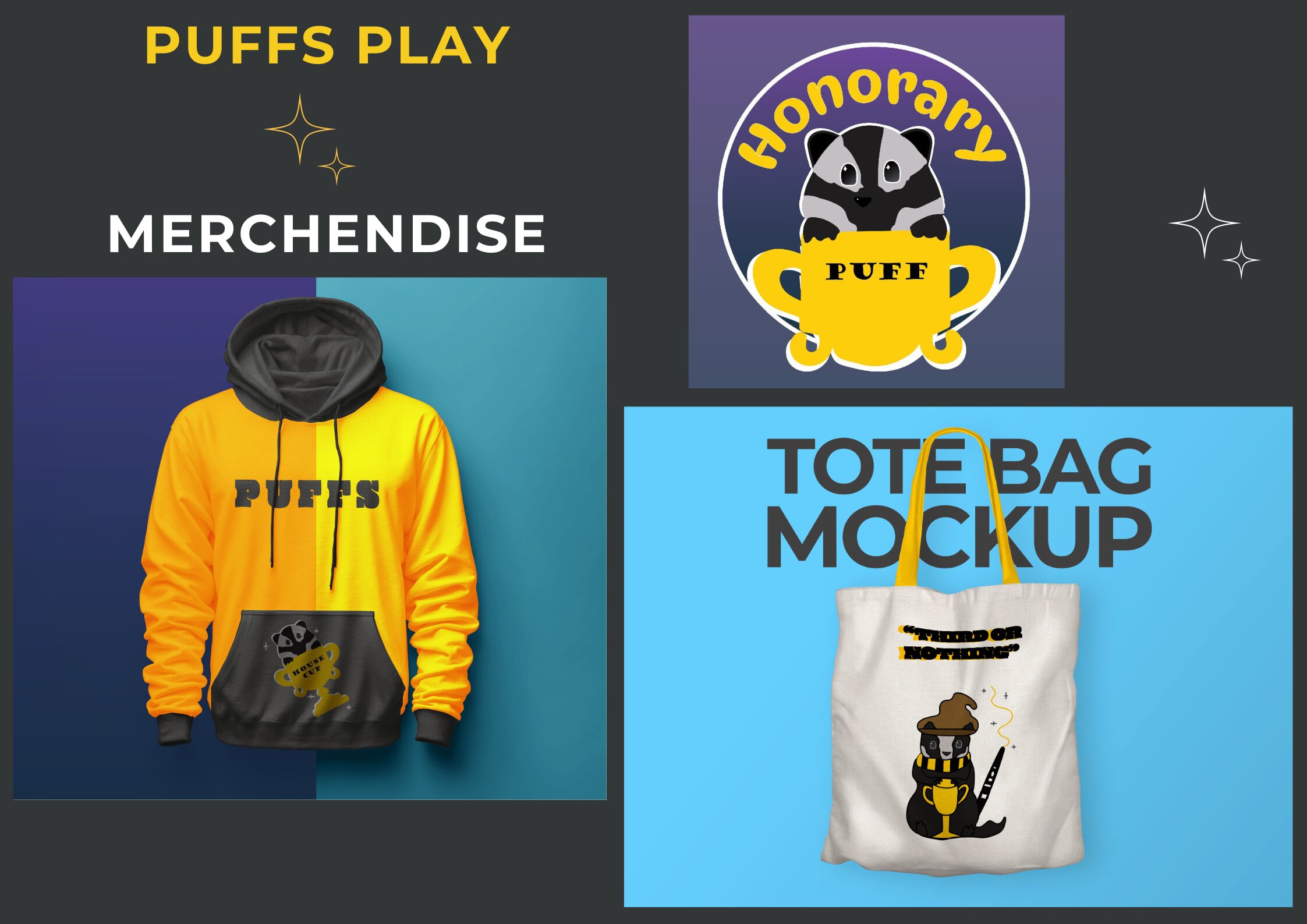This hoodie, badge, and tote bag were designed using Adobe Illustrator and Photoshop as merchandise for the play "Puffs." The play will be performed at Narrabundah College in 2024. The design of this merchandise incorporates elements from the main story in "Puffs," and each item uses similar fonts and colours to create a cohesive set of merchandise.