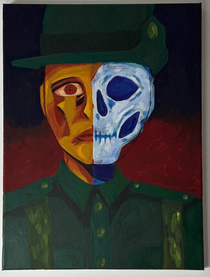 Done on a 40.5cm/30.5cm canvas with gouache paint. Upper torso up painting of a front facing Australian solider with the right half of his face off, showing his skull.