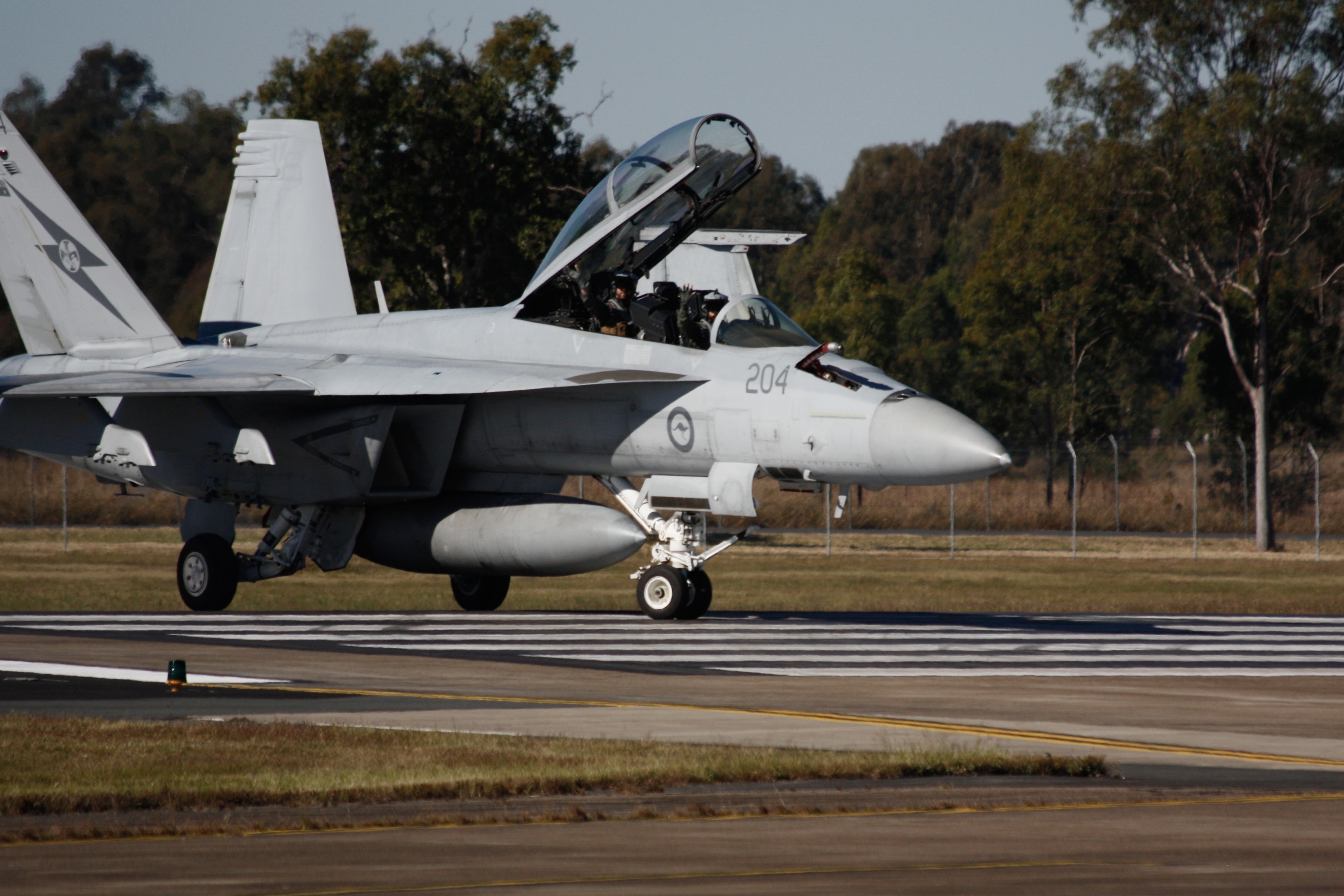 A picture of a 1 SQN fighter jet from the RAAF at RAAF base Amberley. The picture features the jet with its canopy up, wings folded, refueling probe out and pilot and weapons system officer waving to the crowd. This is a very rare sight. It is also the raw photo and had had no post processing done. It was taken on a EOS Canon 450D with a Tamron 18-200mm lens.