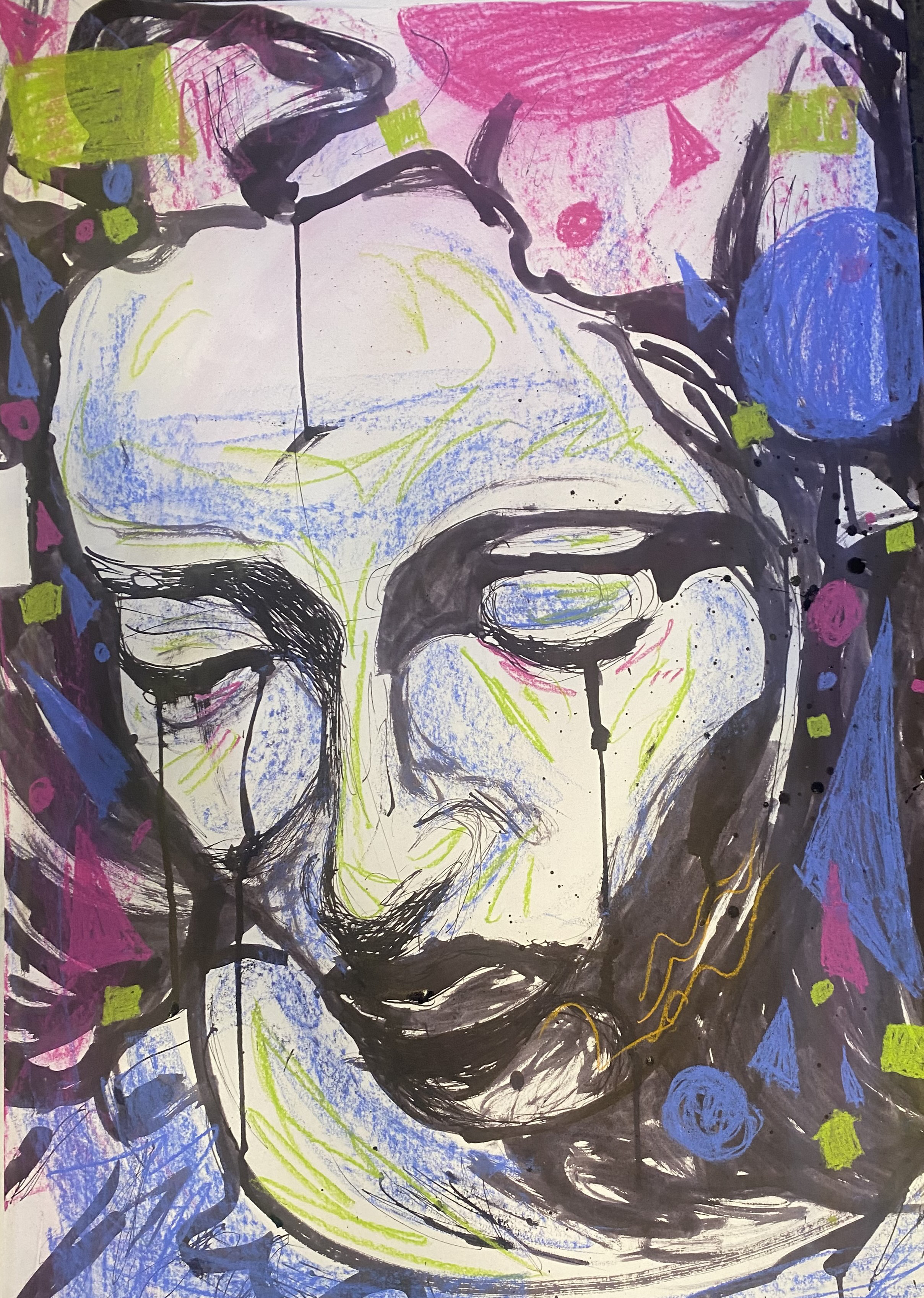 This artwork utilises materials such as colored pastels, charcoal and ink. Complimentary colors such as pink, green and blue were used to create the emotion of Disconnect of which the artwork is named after. Black ink was also used to create prominent shadows and the large outlines of the face and cloth habit of the subject, contrasting the soft colors layered over the top. Simple shapes such as triangles, squares and circles surround the face in floating formations, allowing the portrait to seem as if it's floating in space. Hatching and other drawing methods were also used for shadows.