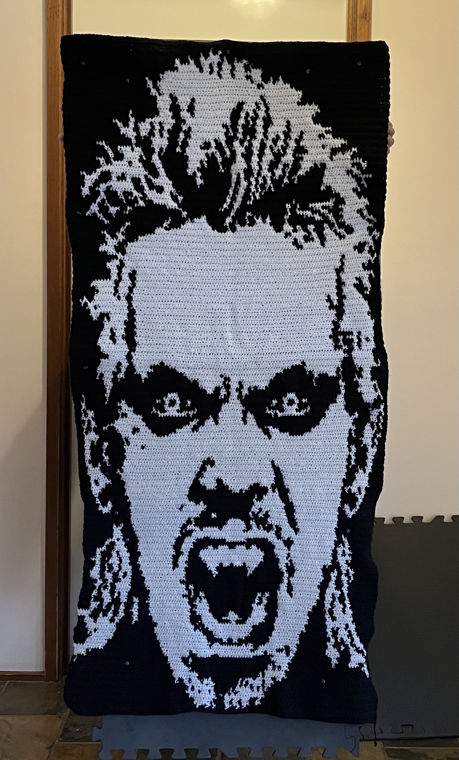 A 7 month crochet tapestry project of David from the film 'The Lost Boys' (1987). Also my favourite movie of all time. It is approximately 75cm x 150cm, used multiple skeins of yarn and over 24,000 stitches total <3