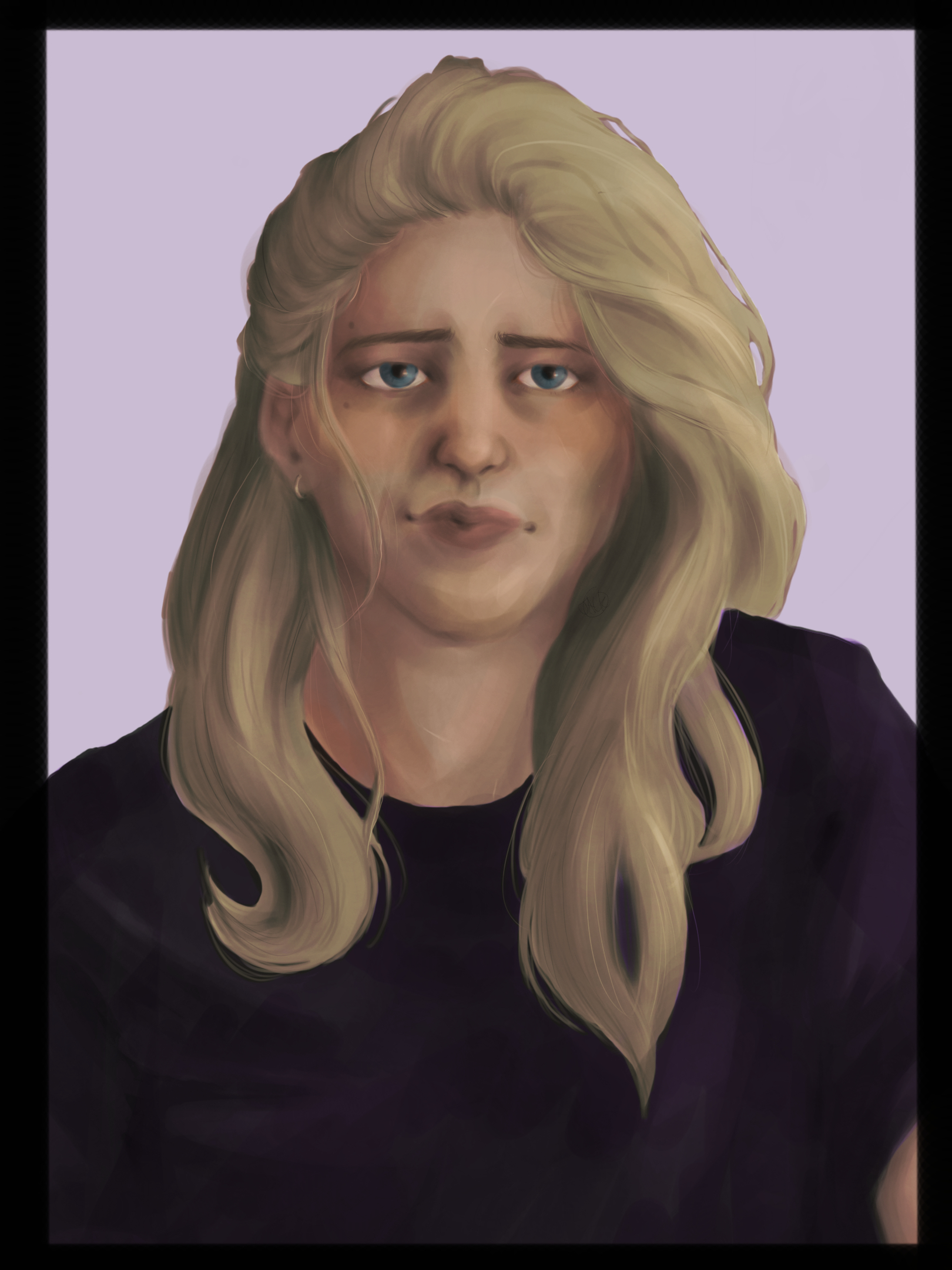 Portrait of Purple Girl is a digitally-painted portrait, unreferenced. The piece took roughly twelve hours to complete and was created on Autodesk Sketchbook. Portrait of Purple Girl features a single subject from the shoulders up, a girl with long blonde hair and blue eyes, wearing a purple shirt.
