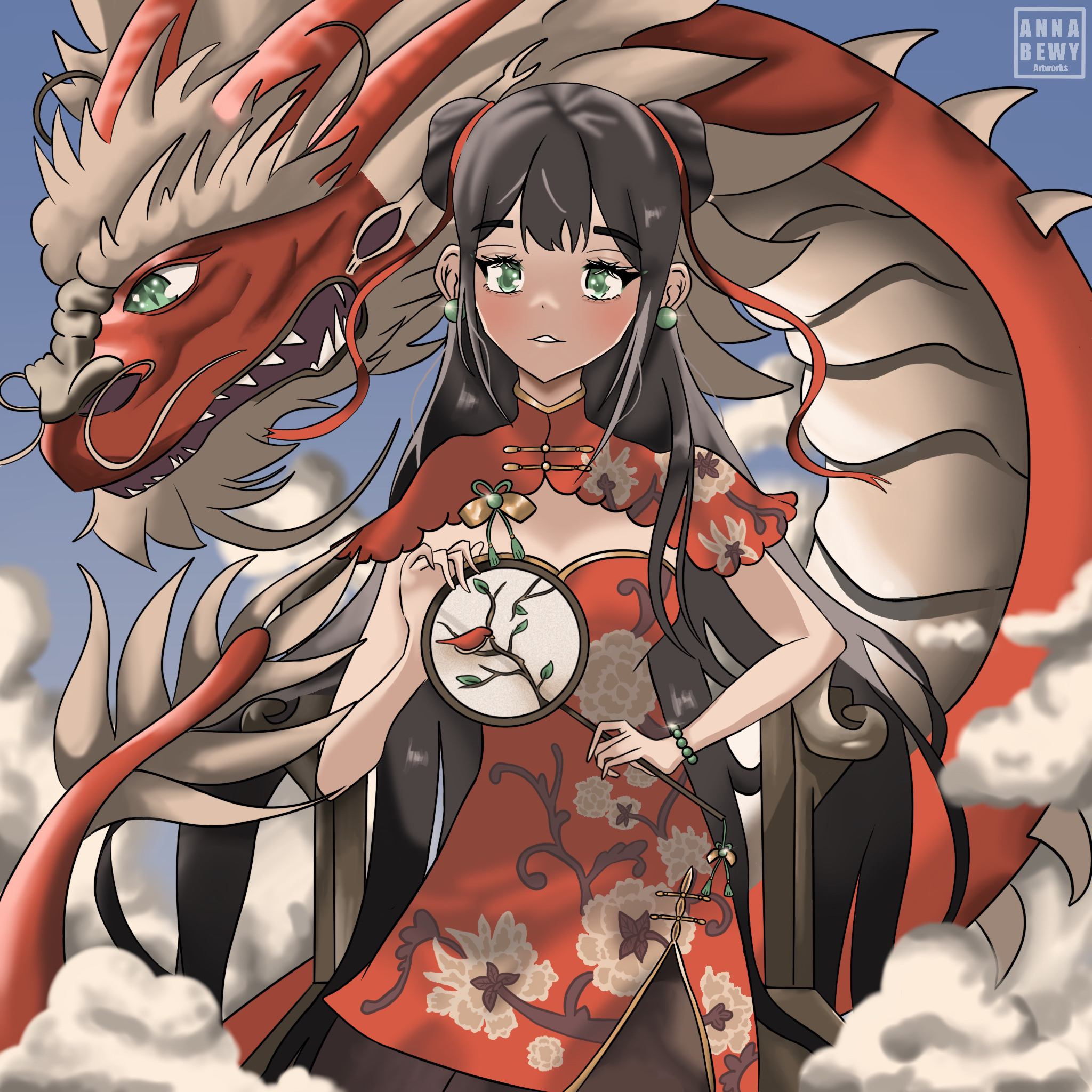 My artwork features a girl dressed in a traditional red qipao, alongside a majestic red dragon in a cloud-filled sky. The scene captures a harmonious blend of tradition, grace, and strength, symbolised by the girl’s calm presence as the dragon watches over her. This artwork was also created to honour the year of the dragon.