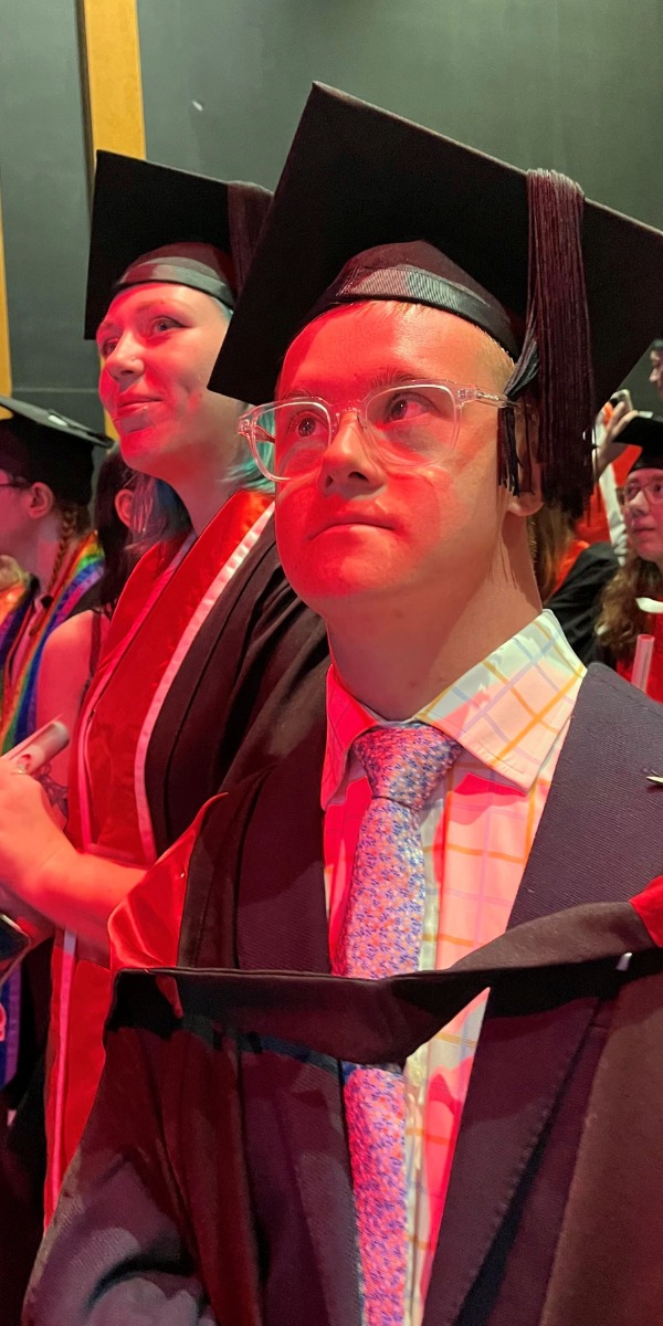 Fifteen years after that fateful Christmas, Rory graduated this week with a Bachelor of Creative Industries (Visual Arts) from the University of Canberra via TAFE Queensland – thought to be among few handfuls of people with Down syndrome worldwide to receive a tertiary degree and only the second in Australia.