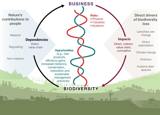 Figure 1. Impacts and dependencies of businesses on biodiversity and nature’s contributions to people (ecosystem services).*